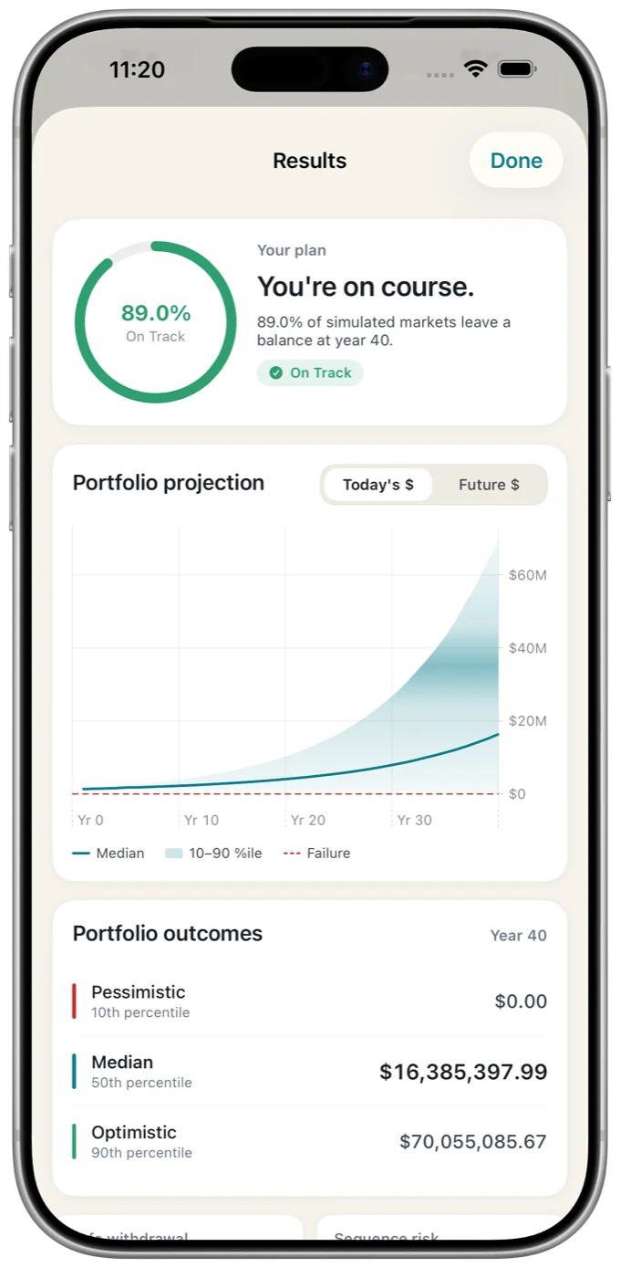 Monte Carlo simulations grounded in 98 years of market data — nothing leaves your device. No account. No tracking. No shared credentials.
